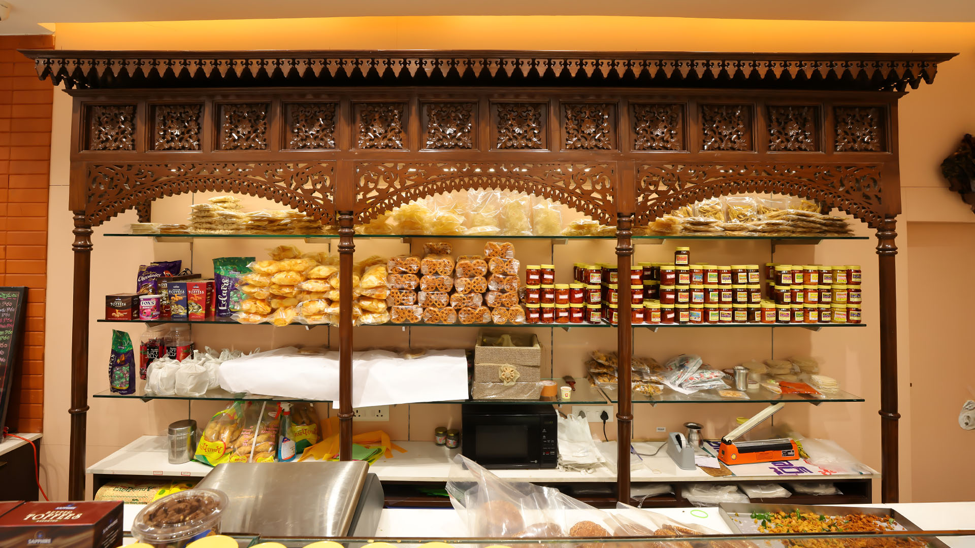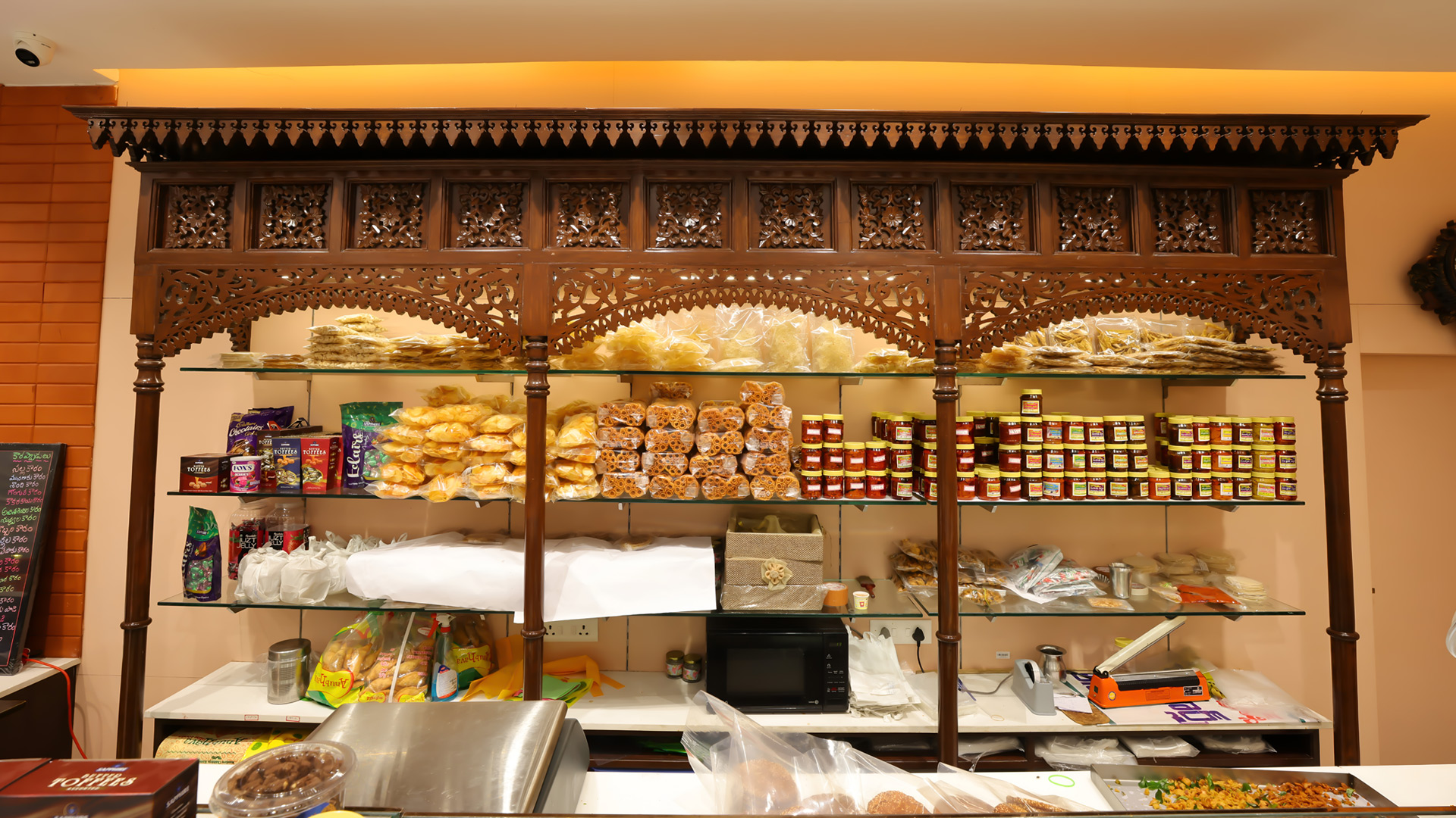 At Anubhava Home Foods, tradition and contemporary elegance intertwine. Terracotta flooring, dark walnut-finished teak furniture, and hand-carved wooden racks evoke warmth and authenticity, while minimalist design keeps craftsmanship at the forefront.