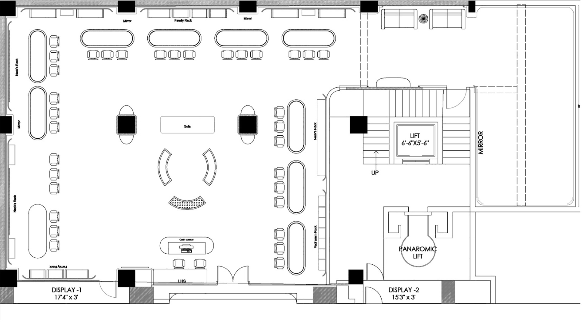 Inside, an intentionally zoned retail space divides into: