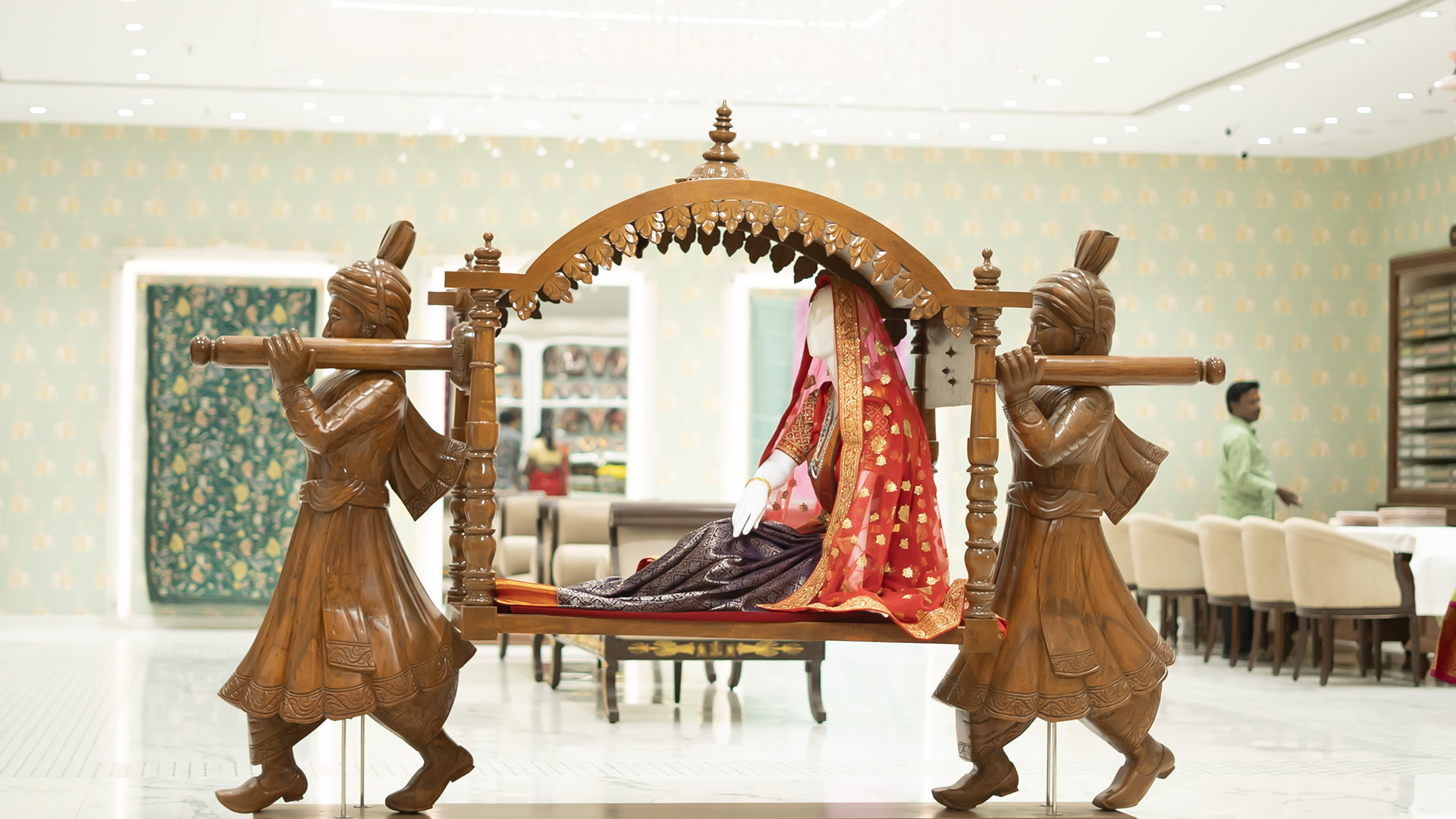 Loom-shaped racks, wooden trumpets, and India's largest in-store Tanjore mural (450 sq. ft.)—depicting Lord Perumal’s celestial wedding—celebrate heritage in an emotionally rich setting.