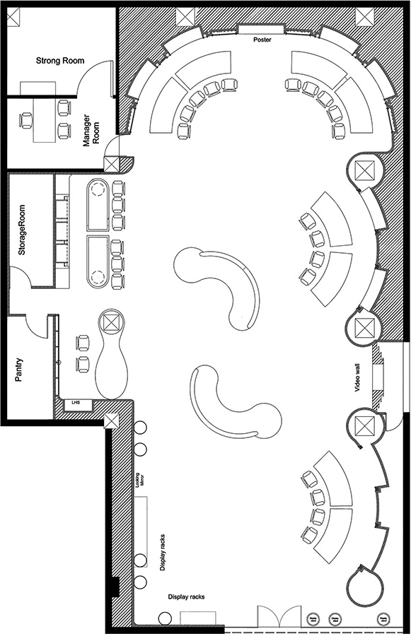 A central seating area, sculpted in an organic form, enhances the space's appeal, while the cash counter, strategically placed on the left, ensures optimal visibility.