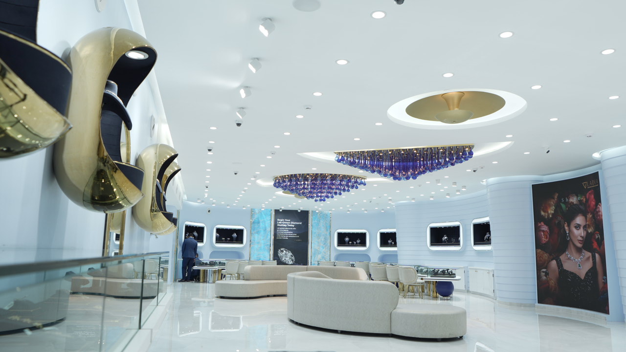 This design reimagines luxury retail through ocean pearl-inspired elements, celebrating the beauty of lab-grown diamonds. A wave-formed chandelier and curved displays around structural pillars enhance flow and elegance. Brass accents and backlit onyx marble create a rich, emotional connection.